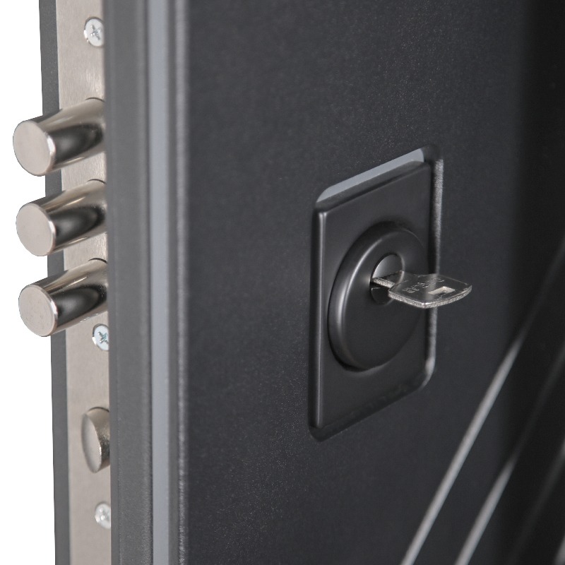 Дополнительно: Евроцилиндр К-В перфокарта. Броненакладка врезная. Штырь противосъемный (3 шт). Порог из нержавеющей стали (цвет «хром»).