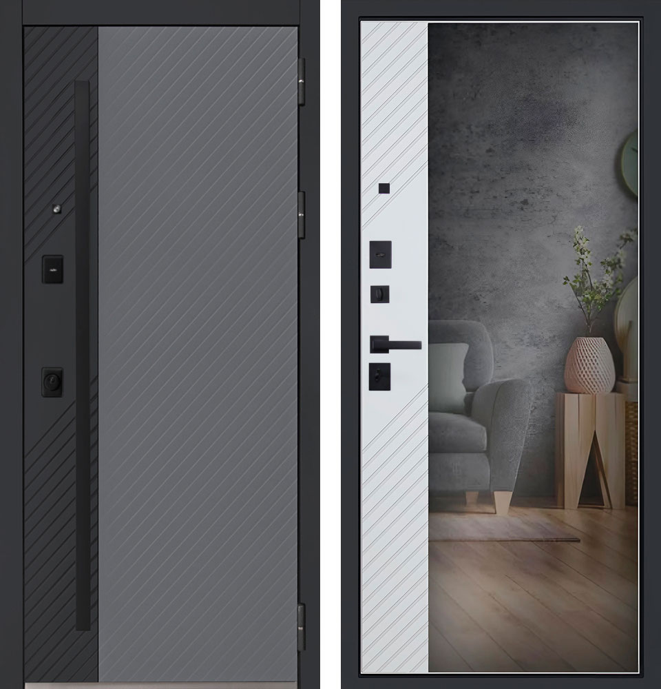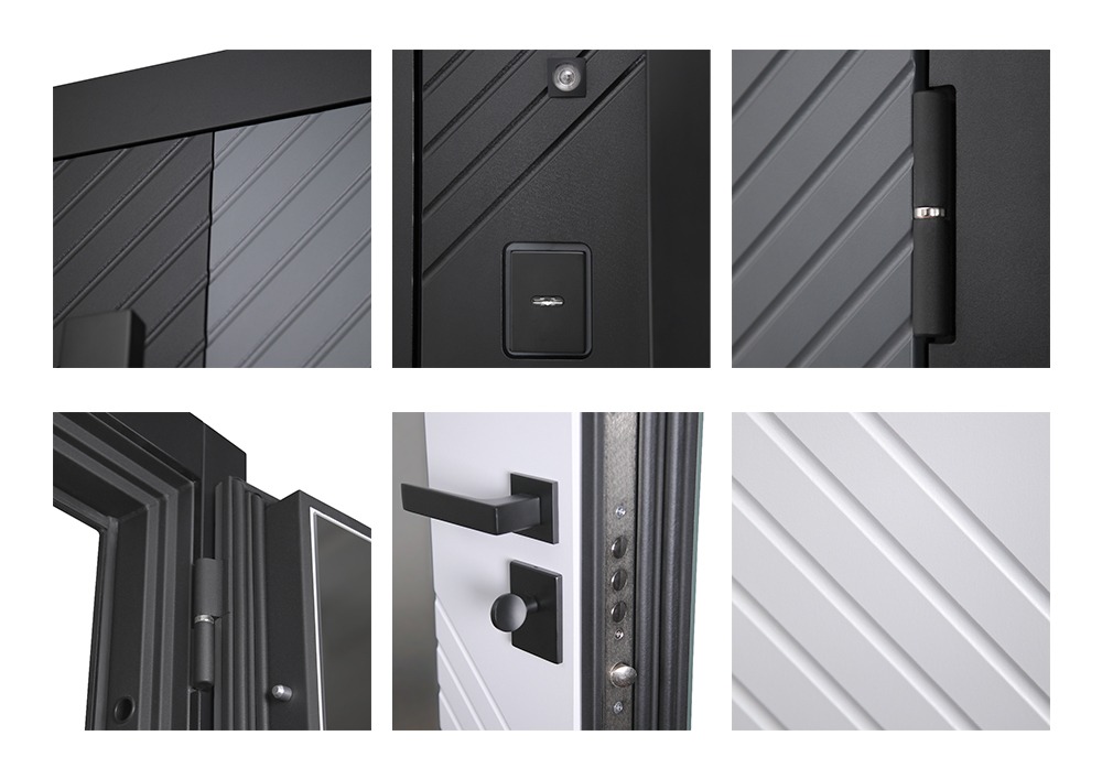 Внешняя отделка: Лист металла 1,5 мм. Панель МДФ 16 мм (цветовая комбинация: «шагрень черная», » velluto oscure AG 710 «). Линейная фрезеровка. Наличник МДФ 80 мм (цвет «шагрень черная»).