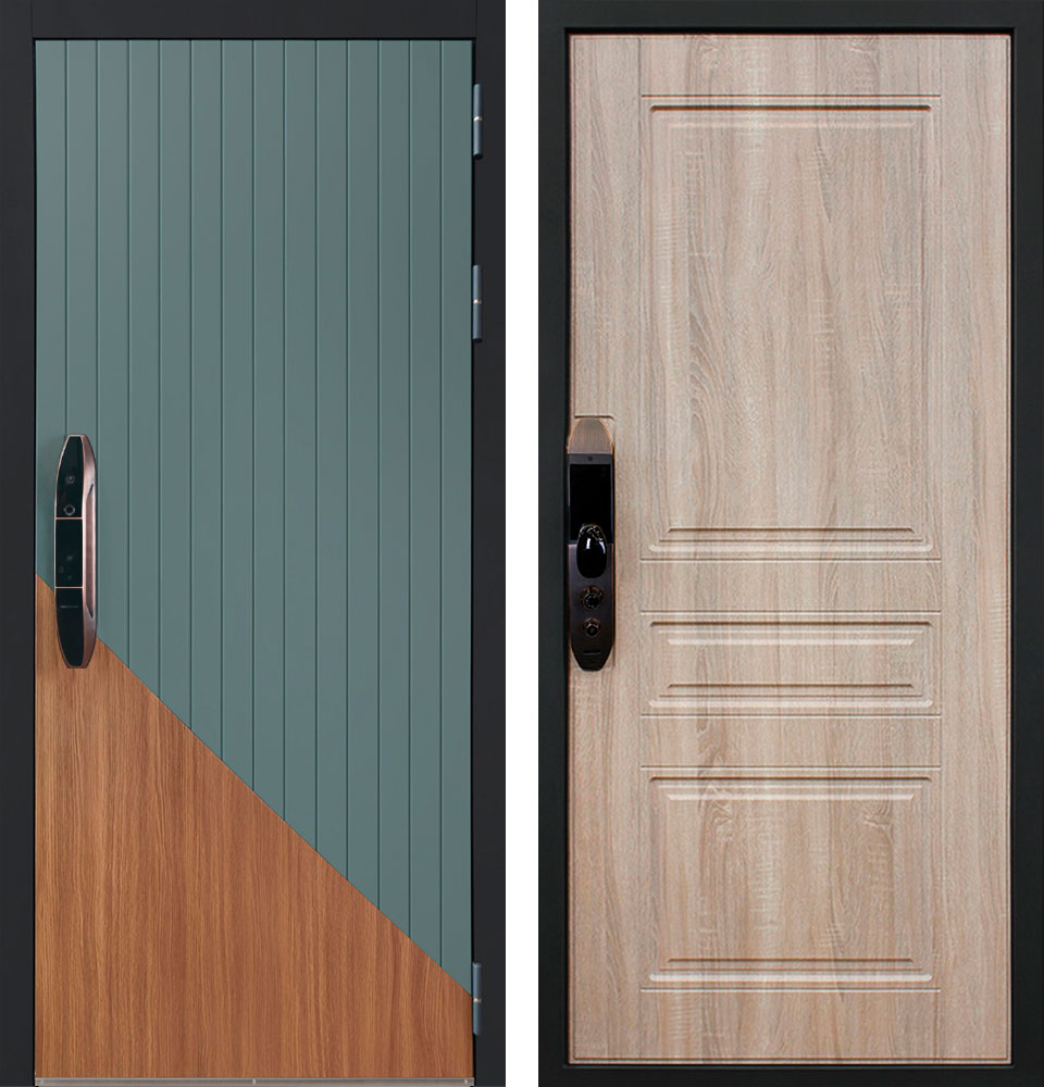 Внешняя отделка: Лист металла 1,8 мм. Панель МДФ 12 мм (цветовая комбанация «дуб кантри», «авокадо»). Объемная фрезеровка. Наличник МДФ 100 мм (цвет «черный кварц»).