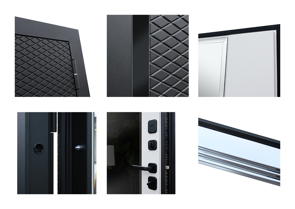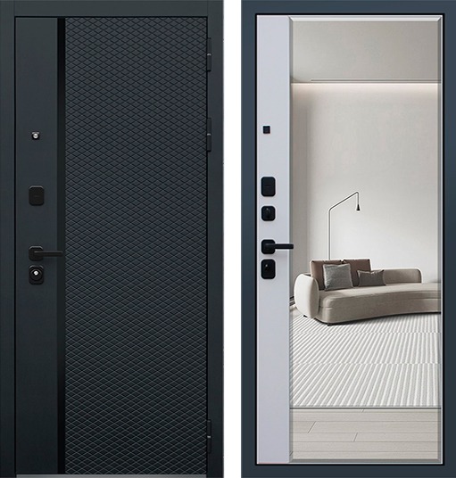 Экошпонированная панель МДФ (10 мм) с объемной фрезеровкой и вставкой из черной лакобели, цвет «Черный кварц». Наружный лист металла 1,5 мм. Наличник гладкий МДФ 80 мм.