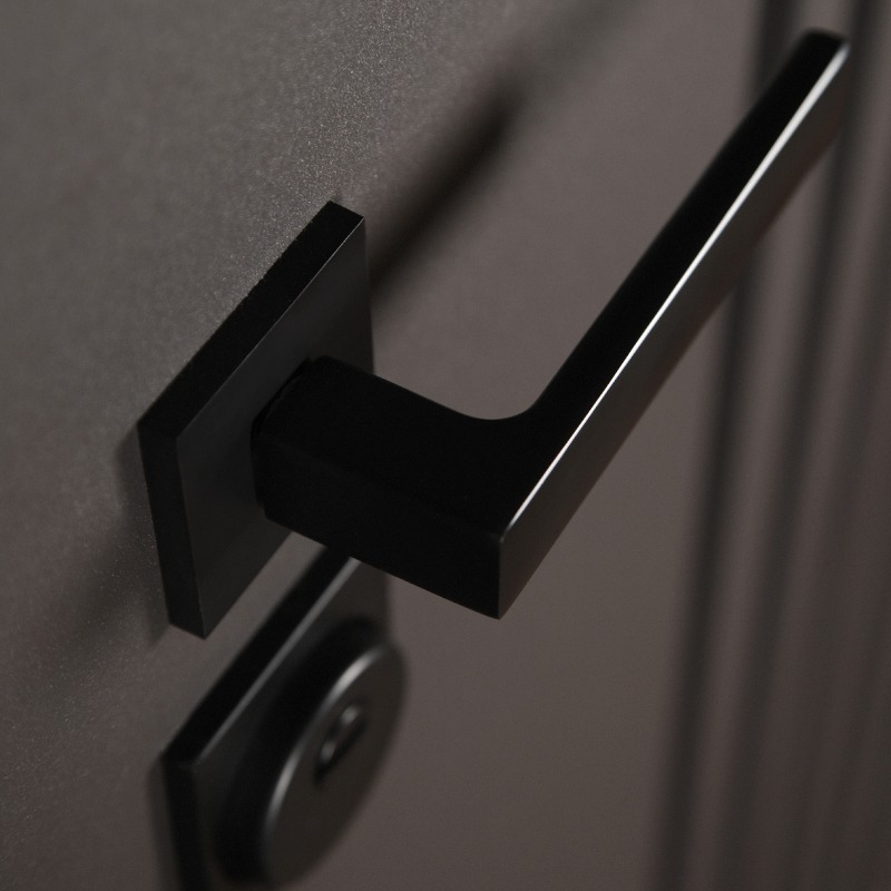 Фурнитура: Снаружи ручка–скоба Art 50х25 Inox Basic Mechanical (цвет ral 9005), датчик (кабель канал). Внутри ручка Fuaro TOR XL BL-24, ночная задвижка FuaroBL-24 на квадратной розетке (цвет «черный»).
