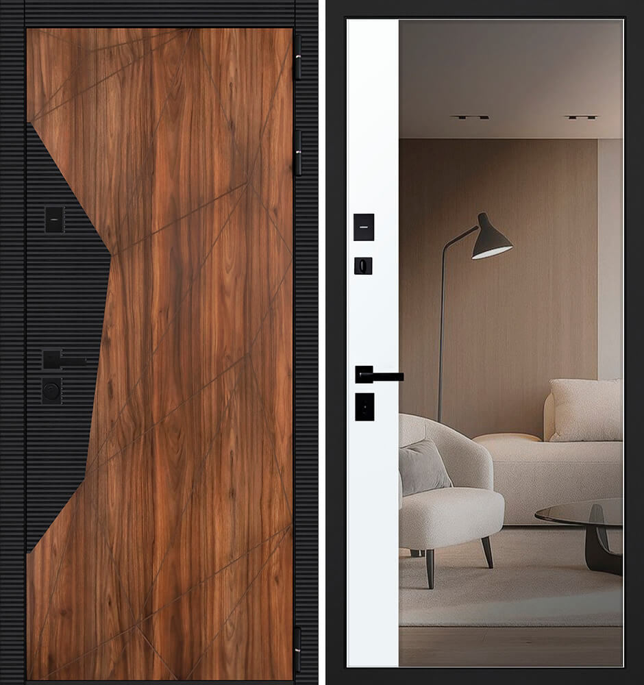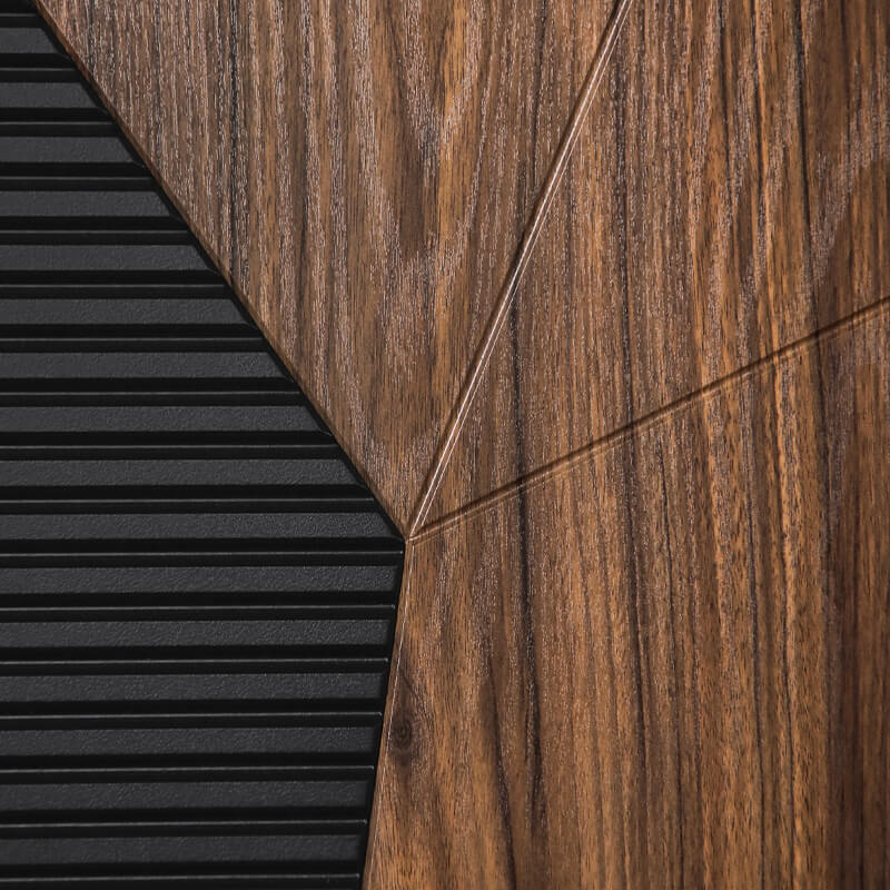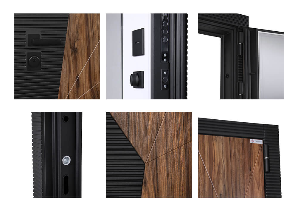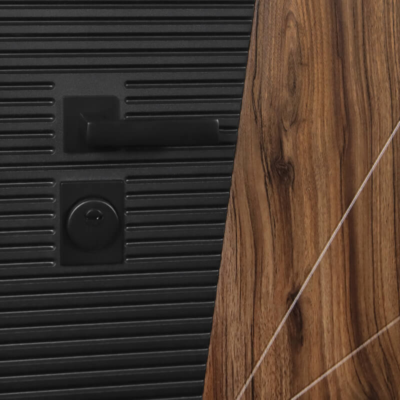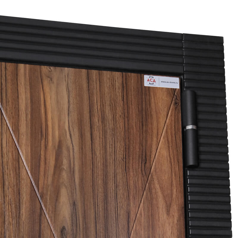 Лист металла 1,5 мм. Экошпонированная дизайнерская панель МДФ 10 мм (цветовая комбинация «дуб старый американский», «шагрень черная»). Наличник МДФ с фрезеровкой 80 мм (цвет «шагрень черная»).