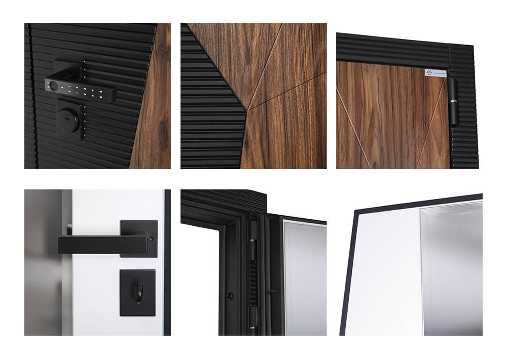 Лист металла 1,5 мм. Экошпонированная дизайнерская панель МДФ 10 мм (цветовая комбинация «дуб старый американский», «шагрень черная»). Наличник МДФ с фрезеровкой 80 мм (цвет «шагрень черная»).